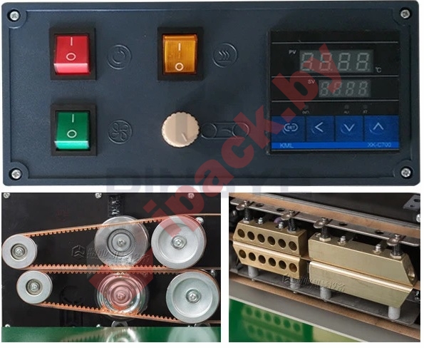Температура и скорость конвейерной ленты плавно регулируются на панели управления запайщика подбирается в зависимости от материала упаковки (это может быть любая термопластическая пленка - полиэтиленовая, полипропиленовая, ПВХ, ламинированная и т.д.). Подача пакета осуществляется справа налево. Конвейерный запайщик имеет систему постоянного нагрева сварочных элементов (ТЭНы). Ширина шва – 12 мм, длина запайки не ограничена.