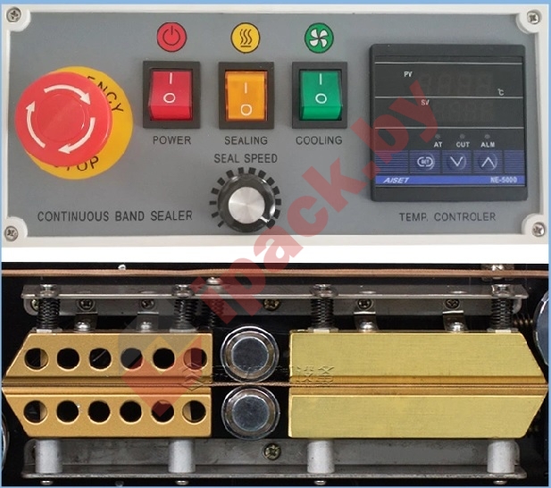 Пакет подается на конвейерную ленту справа налево горизонтально, плашмя. Края пакета вставляются в зазор между двумя запаивающими ремнями и прижимаются двумя нагревающими блоками, пленка расплавляется, плотно соединяется, затем подается в зону охлаждения.