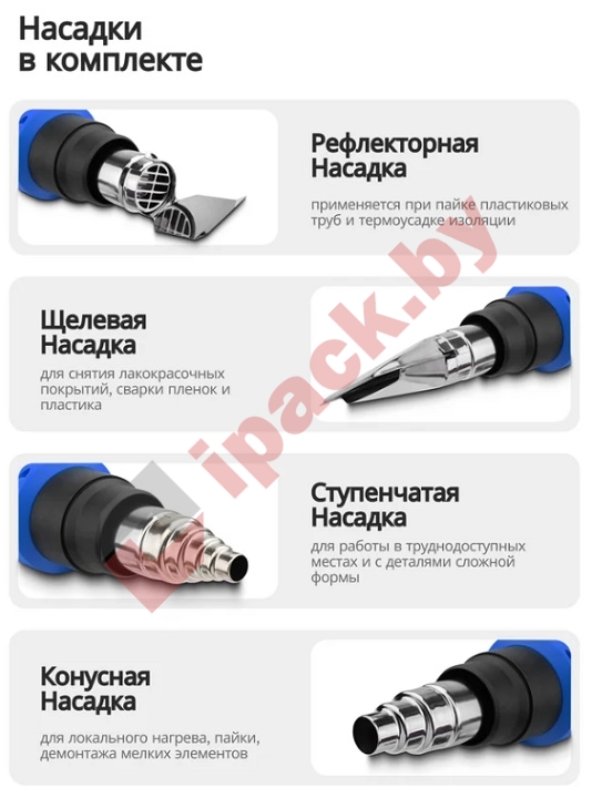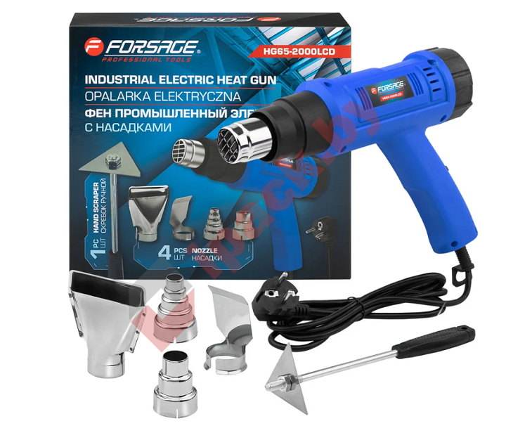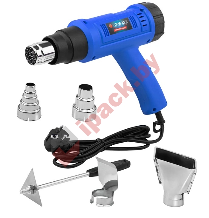 Фен Forsage F-HG65-2000LCD. Мощность 2000 Вт; кол-во скоростей потока воздуха 3; температура от 60 до 600 °C; поток воздуха от 250 до 500 л/мин; режим холодного обдува - есть. Применяется совместно с запайщиком серии SP для усадки пленки (SP-300, SP-450, SP-600).