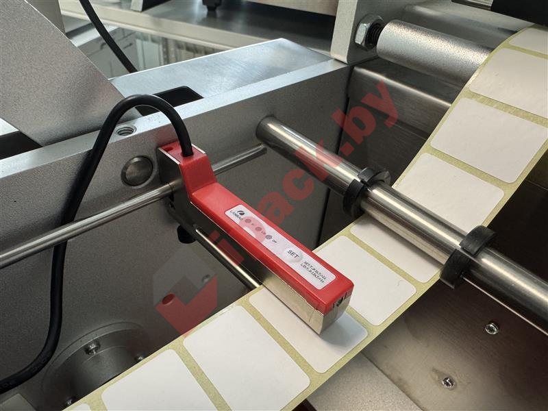 Этикетка подается из рулона, подложка от этикетки сматывается на приводной вал.